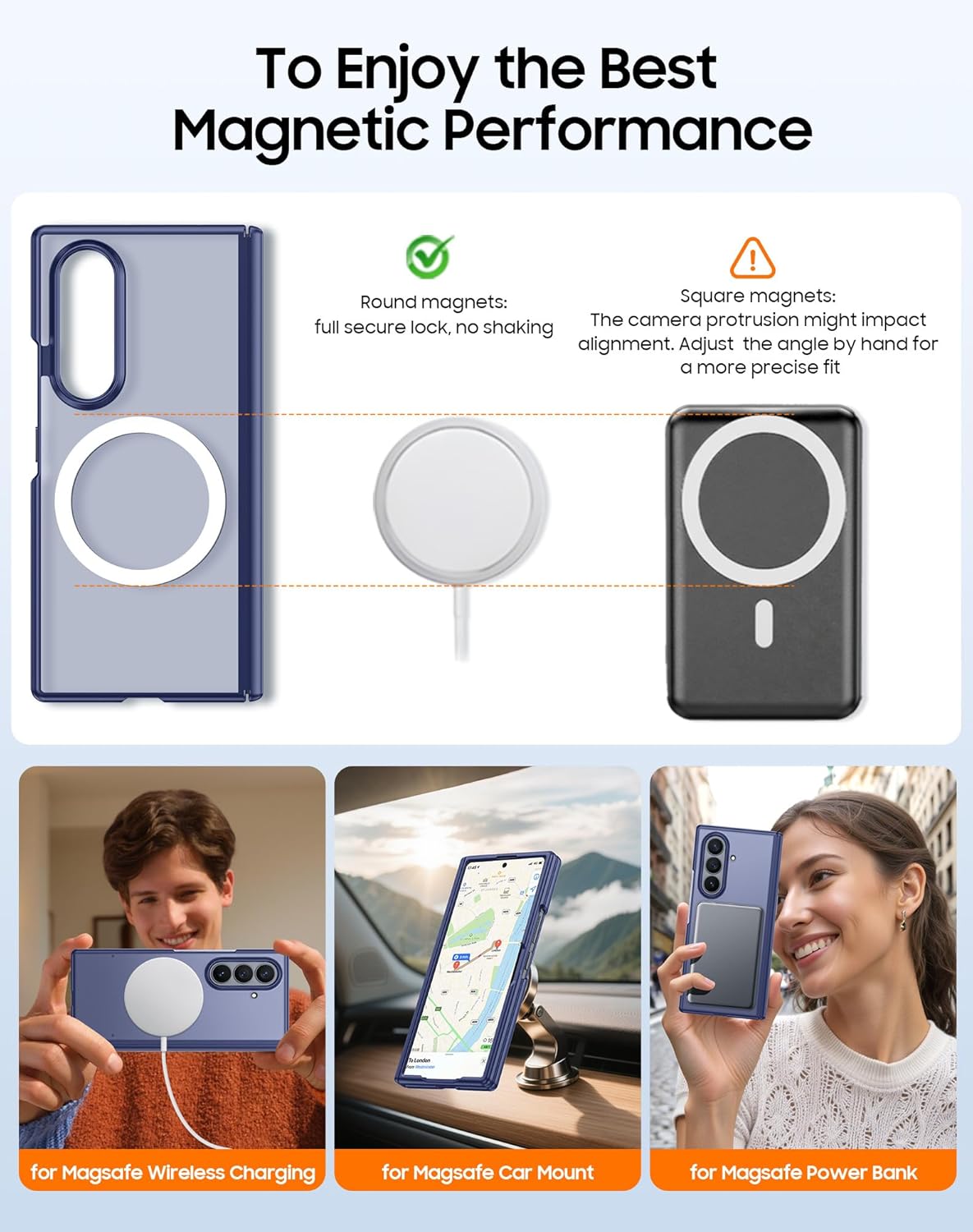 [Compatible with All MagSafe Accessories] Enjoy a stronger, safer, and faster charging experience. The newly upgraded Samsung Galaxy Z Fold 7 Case is compatible with all MagSafe chargers and accessories, including chargers, wallets, power banks, and car mounts. Built-in Super N52 magnets significantly enhance magnetic attraction, ensuring a secure attachment no matter how your phone is rotated or shaken