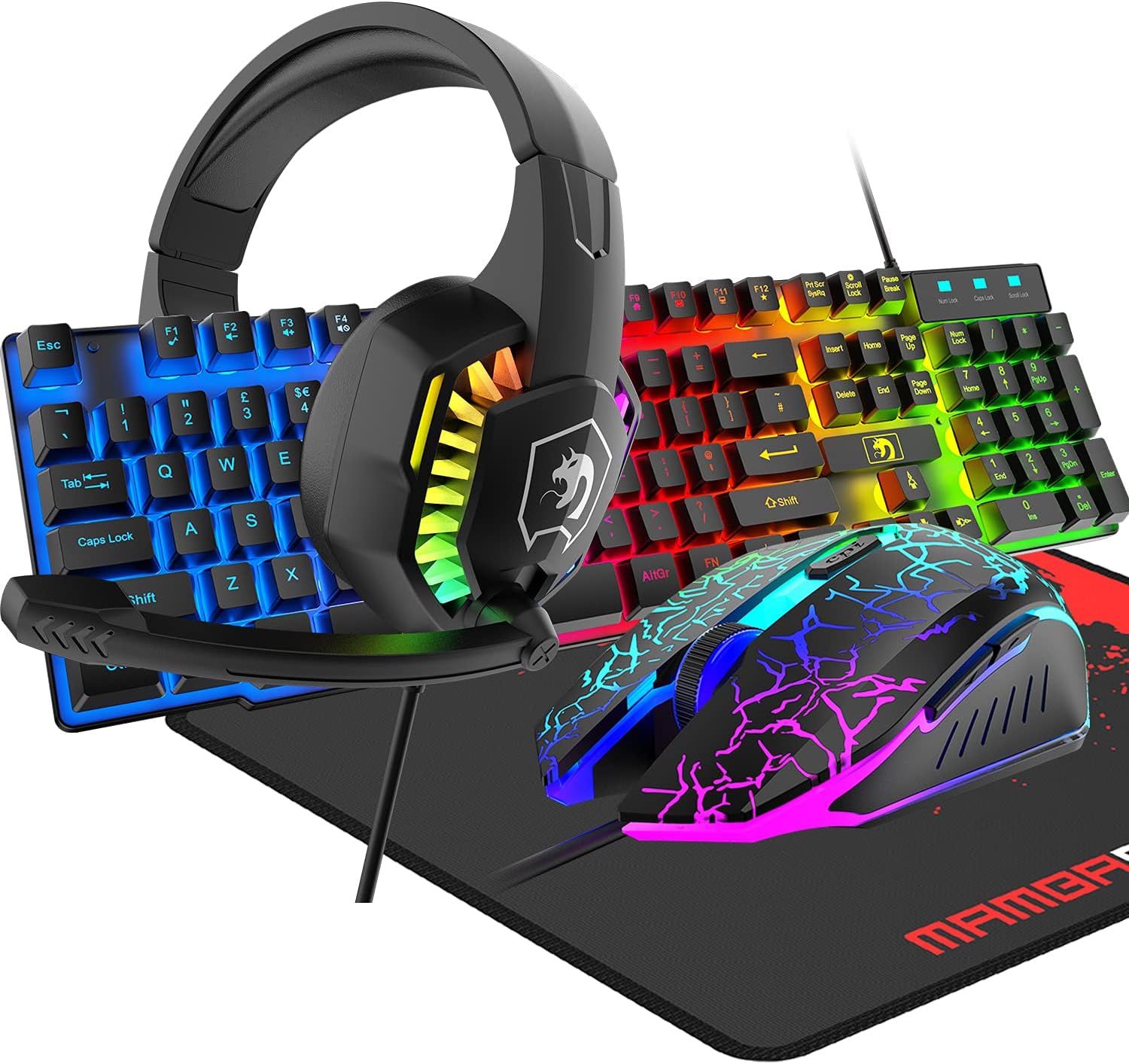 【All in One Gaming Kit】This RGB gaming set gather 104 key keyboard, crack printed mouse, headset, and mousepad, considering all you need to complete your entertainment needs or game room buildup, very convenient. The keyboard, mouse, headset and speaker are all designed with RGB backlight and ergonomic structure with suitable size, keyboard also support 19 key anti-ghosting function, and create a enjoyable using experience for gaming or typing