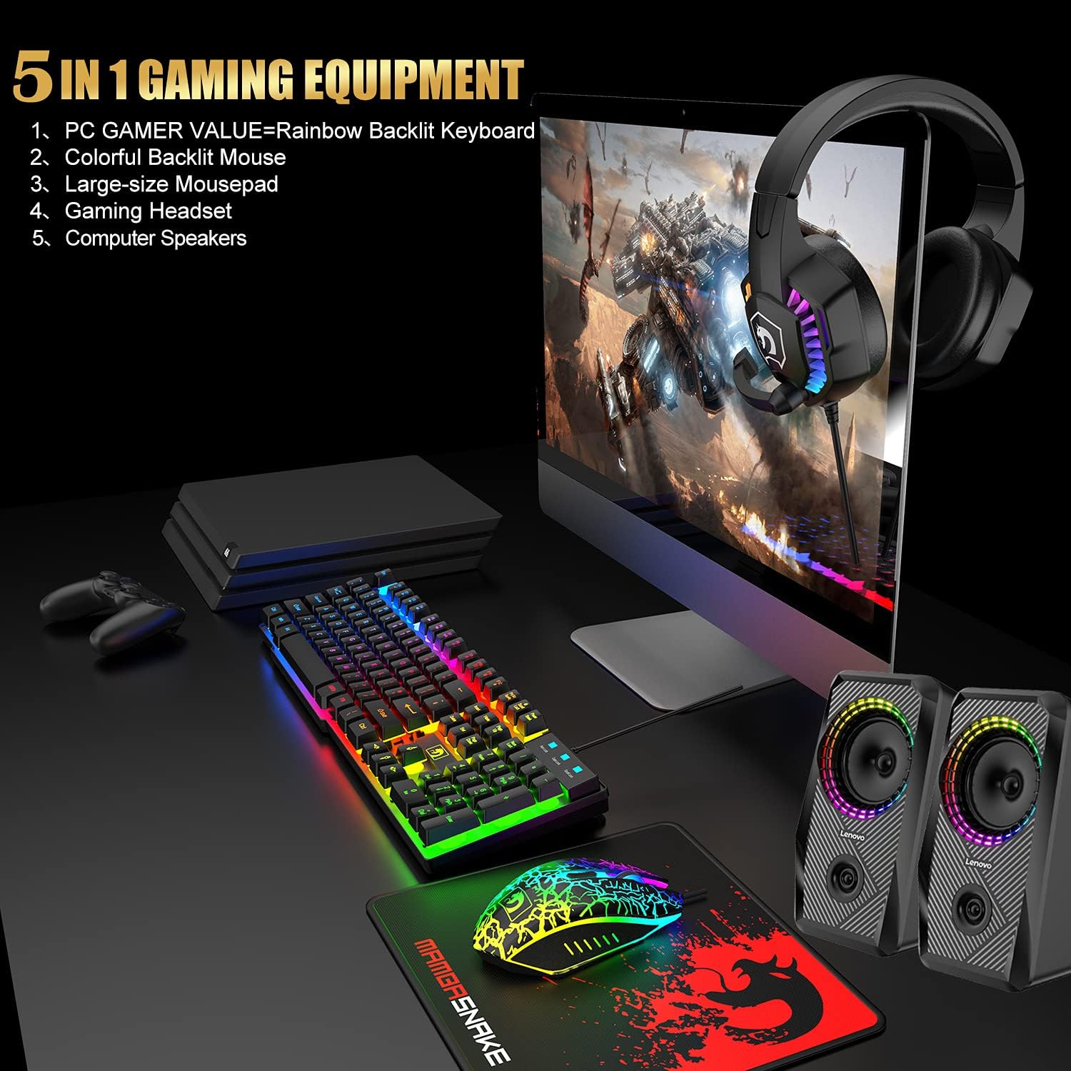 【All in One Gaming Kit】This RGB gaming set gather 104 key keyboard, crack printed mouse, headset, and mousepad, considering all you need to complete your entertainment needs or game room buildup, very convenient. The keyboard, mouse, headset and speaker are all designed with RGB backlight and ergonomic structure with suitable size, keyboard also support 19 key anti-ghosting function, and create a enjoyable using experience for gaming or typing