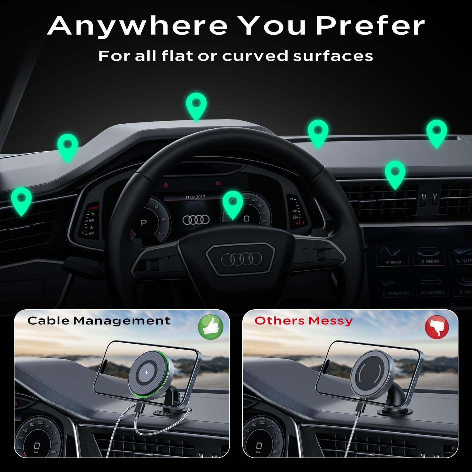 🚗[Strong Suction Base, Versatile Mounting Options] To cater to a wider range of users, we have thoroughly examined the internal structure of various car models. Our mag-safe car mount can be easily installed on the car air vent, dashboard, windshield, or desk. The stable air vent clip is suitable for both horizontal and vertical vents, making it compatible with all car models.