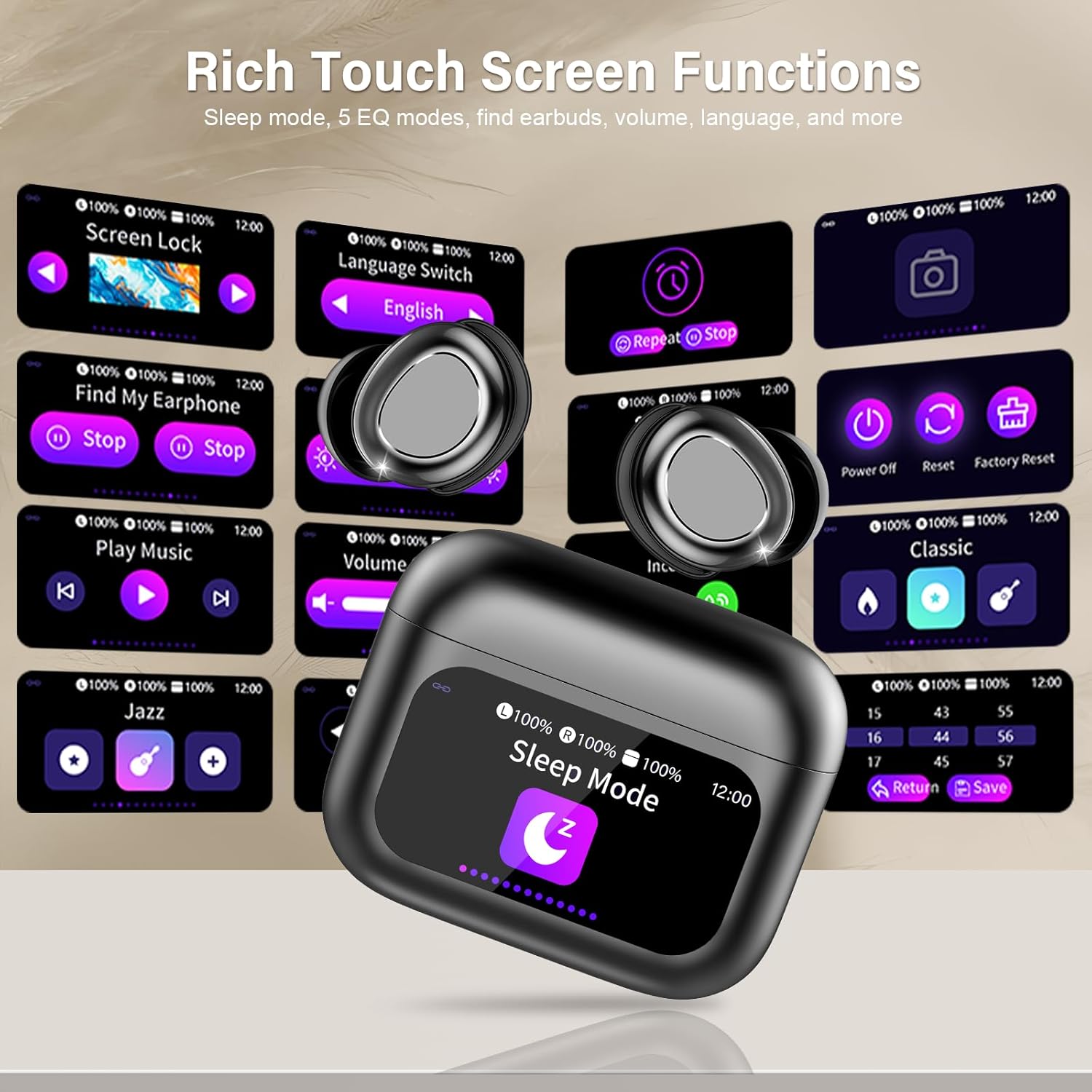 Multifunctional smart touch screen: Our noise cancelling earbuds feature a Smart Multifunctional Touch Screen Charging Case, you can use the earphones or the charging case to control music playback, switch tracks, answer and hang up calls, activate noise-canceling mode, and more. In addition, in ear headphones case also has screen brightness adjustments, wallpaper customization, find headphones, adjust time, and other functions. Perfect for tech-savvy users who appreciate sleek and modern design.