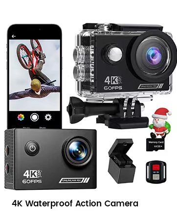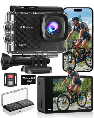 4K Action Camera with 64GB Memory Card: 4K 60fps video camera and HD 48MP photos. The sports camera has a faster sensor and good low light performance. We have a 64GB memory card for our sports camera, so you don’t have to buy an extra memory card.