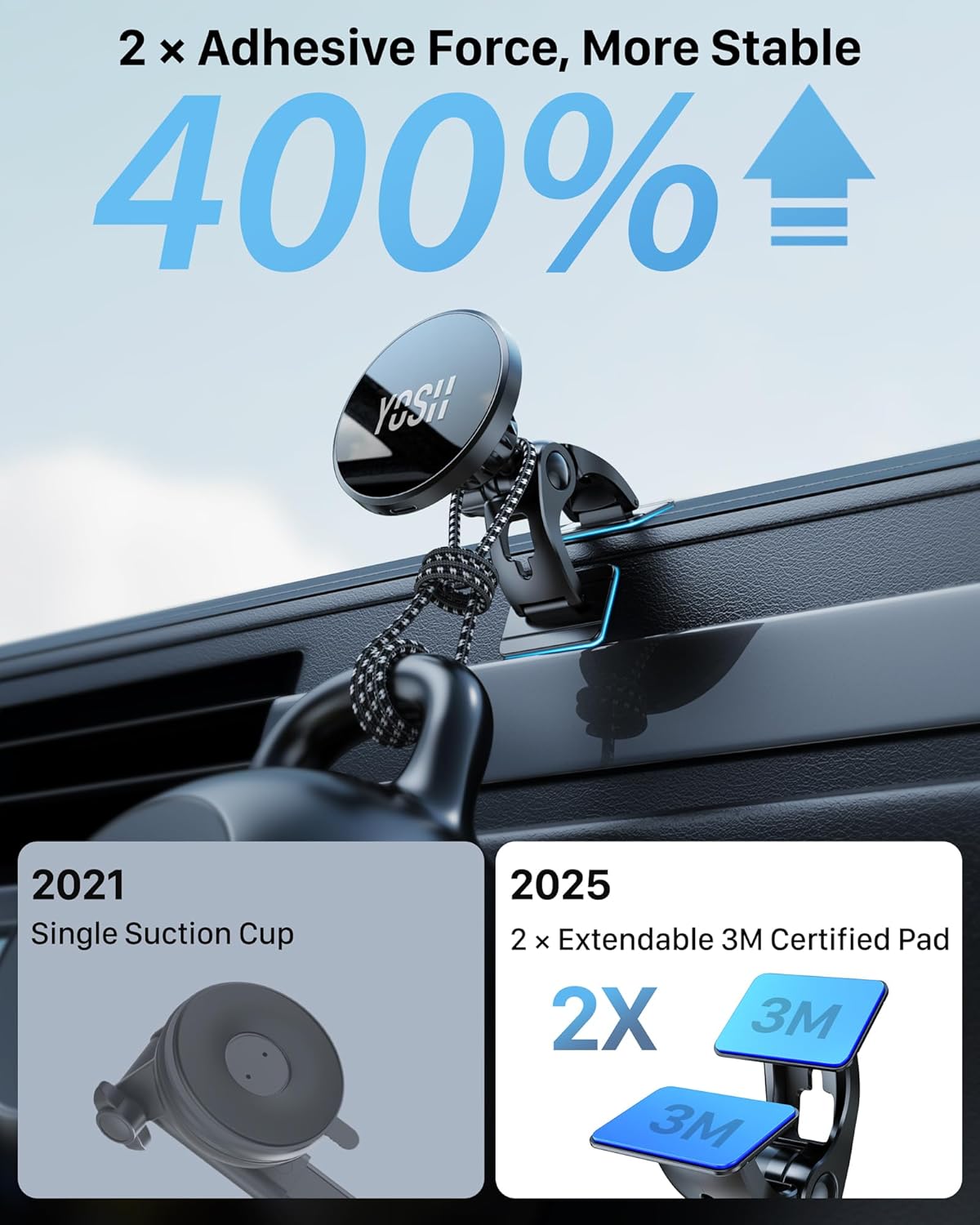 Strong 3M Base & Flexible Fit – Dual 42×25mm adhesive pads and a bendable PP base ensure a secure fit on dashboards. Uses genuine 3M VHB GPH160 (1.6mm thick) for ultra-strong grip with no residue