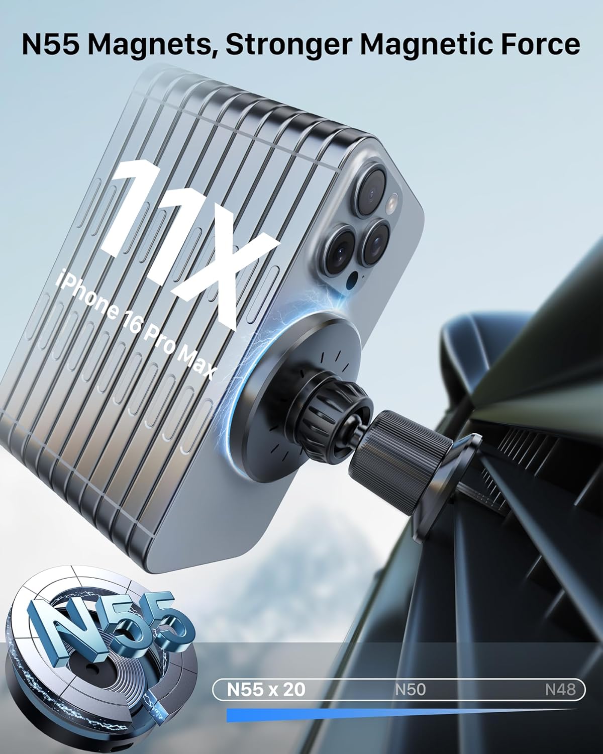 Magnetic Car Phone Charger with Powerful N55 Magnets: Featuring 20 ultra-thin (0.48 mm) N55 magnets, this mag-safe car mount charger provides an exceptionally strong and reliable hold—your phone stays securely in place through sharp turns and rough roads, giving you complete peace of mind while driving