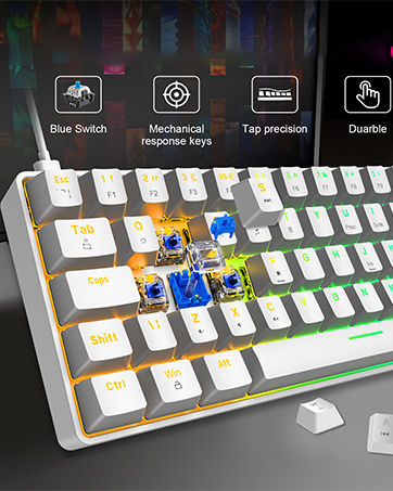 【Blue Switch Mechanical Keyboard】This 62 keys gaming keyboard is equipped with the classic blue switch to provide higher feedback and clearer “click” sound, can be clicked up to 50 million times and excellent touch sensitivity and responsiveness. Each key is controlled by an independent switch, allows multiple keys to work at high speed at the same time, complete key conflict function and provides quick feedback on clicks.