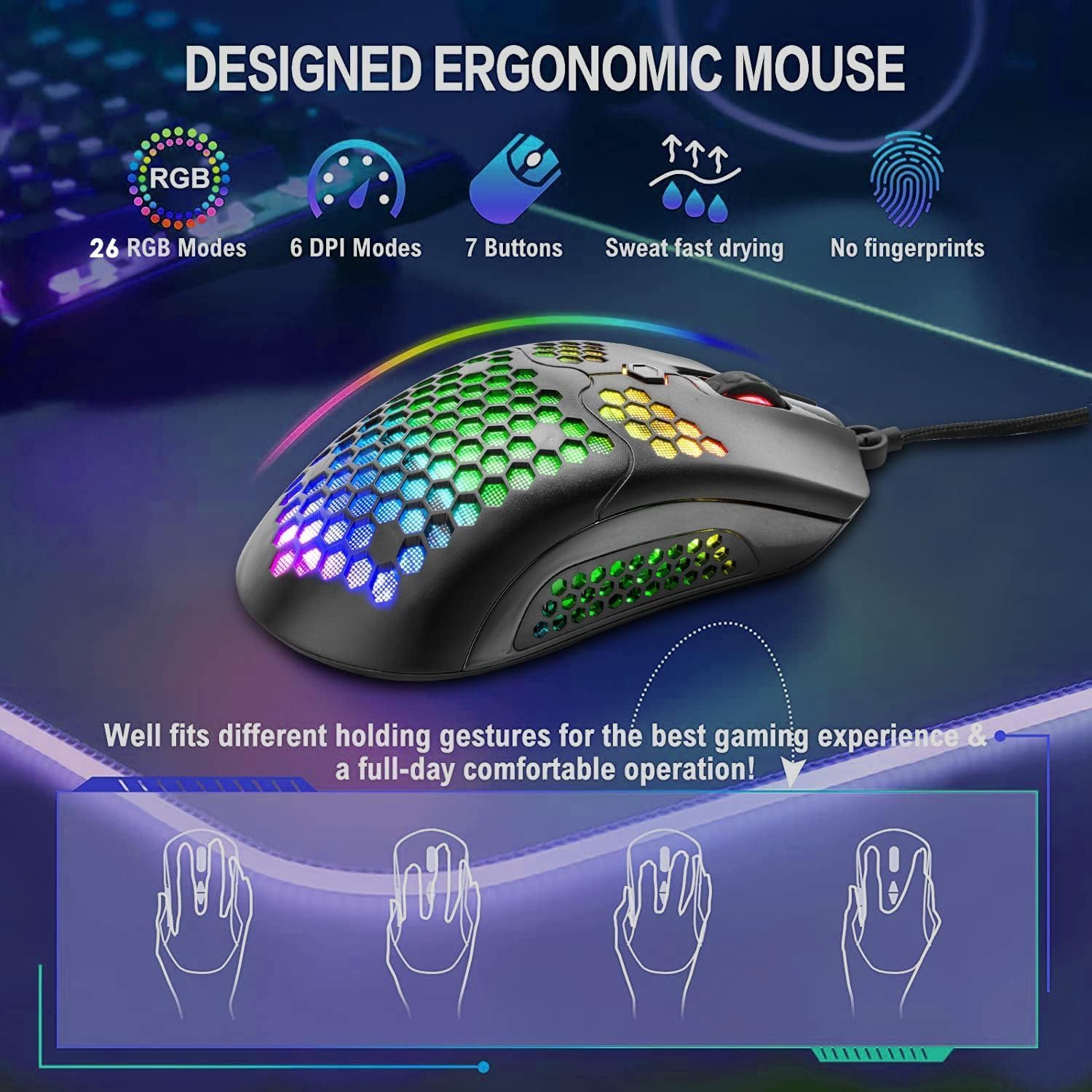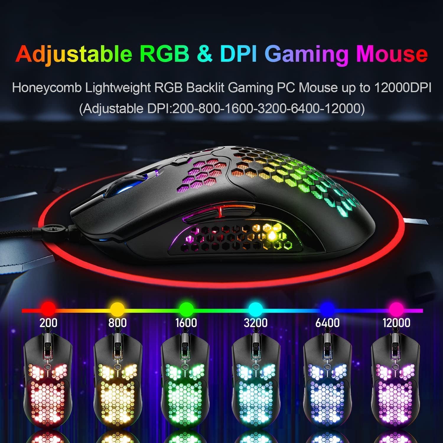【12000 DPI Rainbow Gaming Mouse】The RGB gaming mouse features 1.68 billion colors of magical RGB streamer lighting effects, providing excellent visual effects. The wired professional gaming mouse uses custom hard-core chips, high-precision Pixart PAW3325 optical sensor, up to 12000 dpi (level 6 / changeable). It is only 2.29 ounces (65 grams), designed with a lightweight O-shaped honeycomb shell, which is very convenient to use.