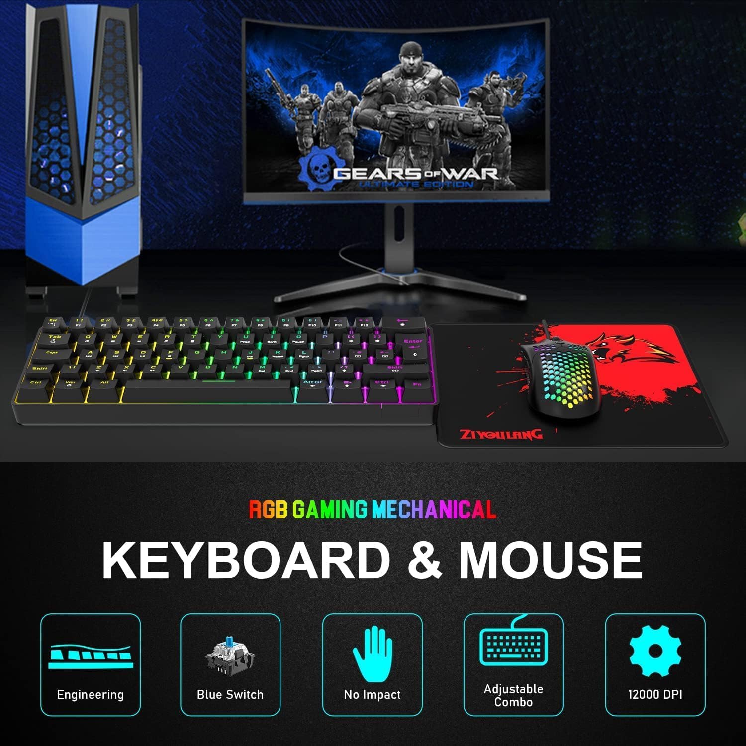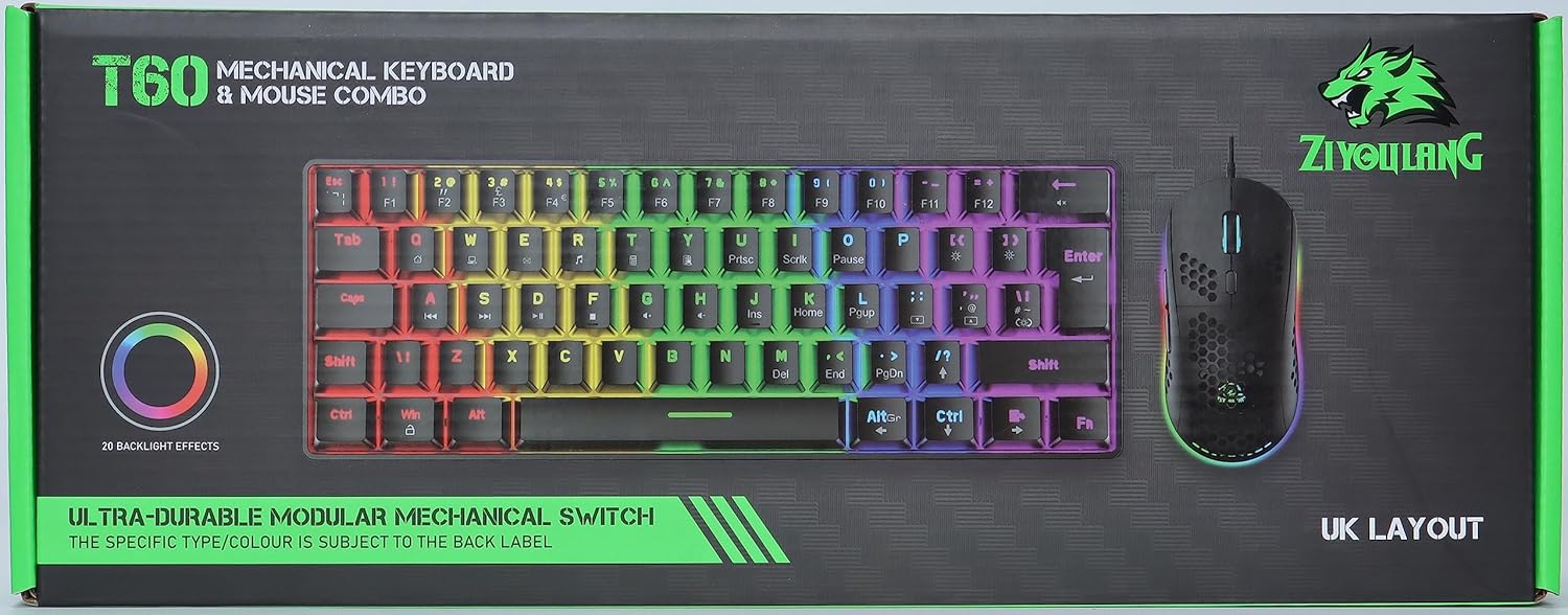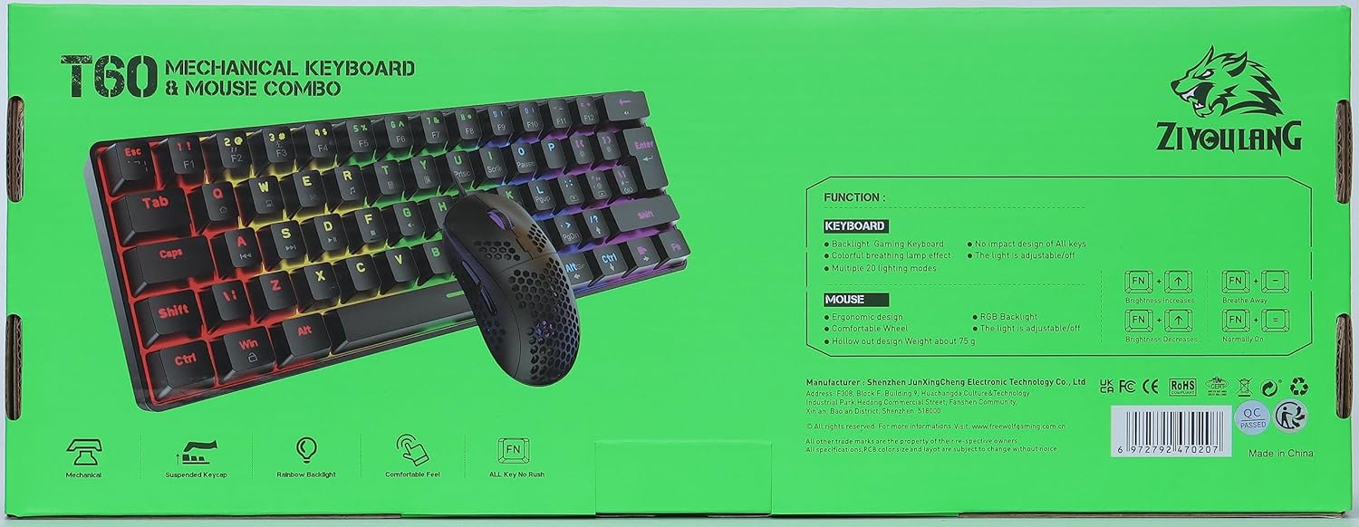 【Three in one combination】One RGB mechanical gaming keyboard + One 12000 DPI rainbow light ergonomics game game + one high quality gaming mat in one box. The keyboard is a classic British layout, compact mini 62 key, full key anti-ghosting, detachable buttons, cap and play; The mouse is the classic gaming shape, 6 adjustable DPI, adjustable rainbow backlight, can add colors to the desktop when you play and work.