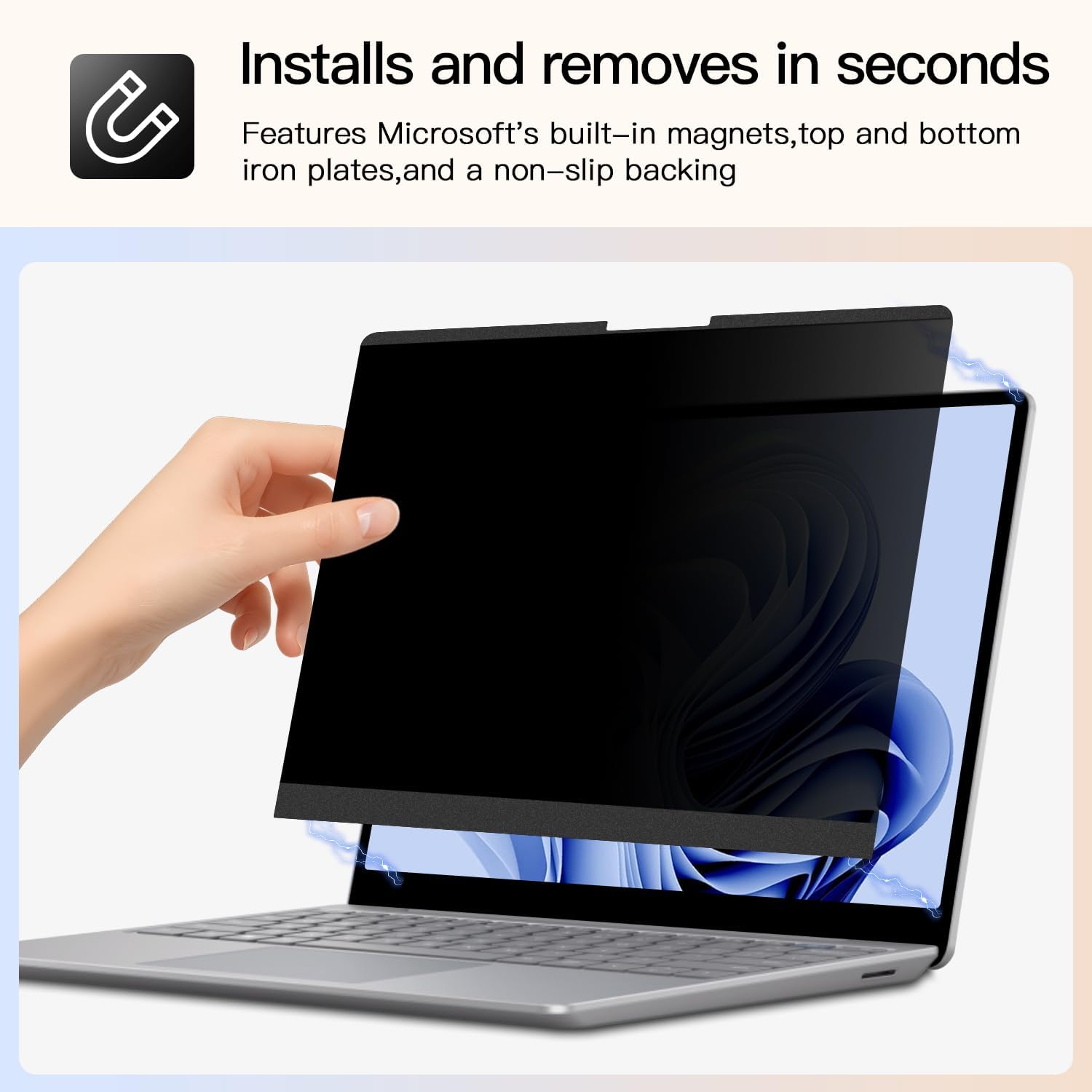 Magnetic & Anti-Slip Fit:The Surface Laptop 5 privacy screen comes with a built-in iron sheet (top) for magnetic hold and nano anti-slip strips (bottom) – no double-sided tapes needed.Installs quickly,removes easily,leaving no residue.